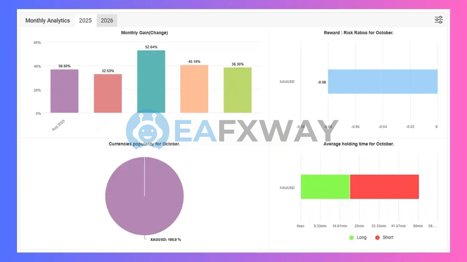 Monthly gains held between 32.53% and 52.64% across all five tracked months with XAUUSD as the sole instrument.