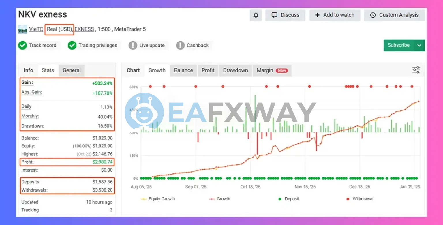 NKV EA MT5 is a live-tracked XAUUSD scalper running on a real Exness account, verified via MyFxBook from August 2025 with +503.24% gain and 16.50% peak drawdown over five months. MyFxBook tracking records a 2.01 profit factor across 2,374 trades with 92% combined win rate. Listed on eafxway after meeting live verification and drawdown threshold criteria.