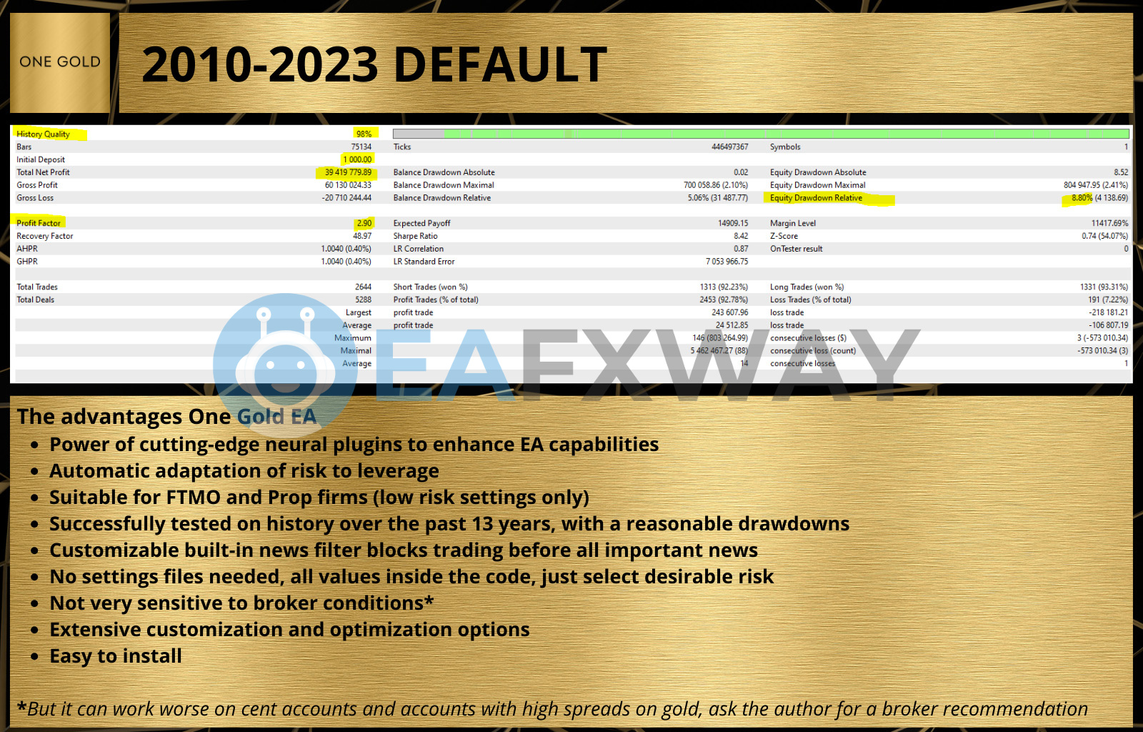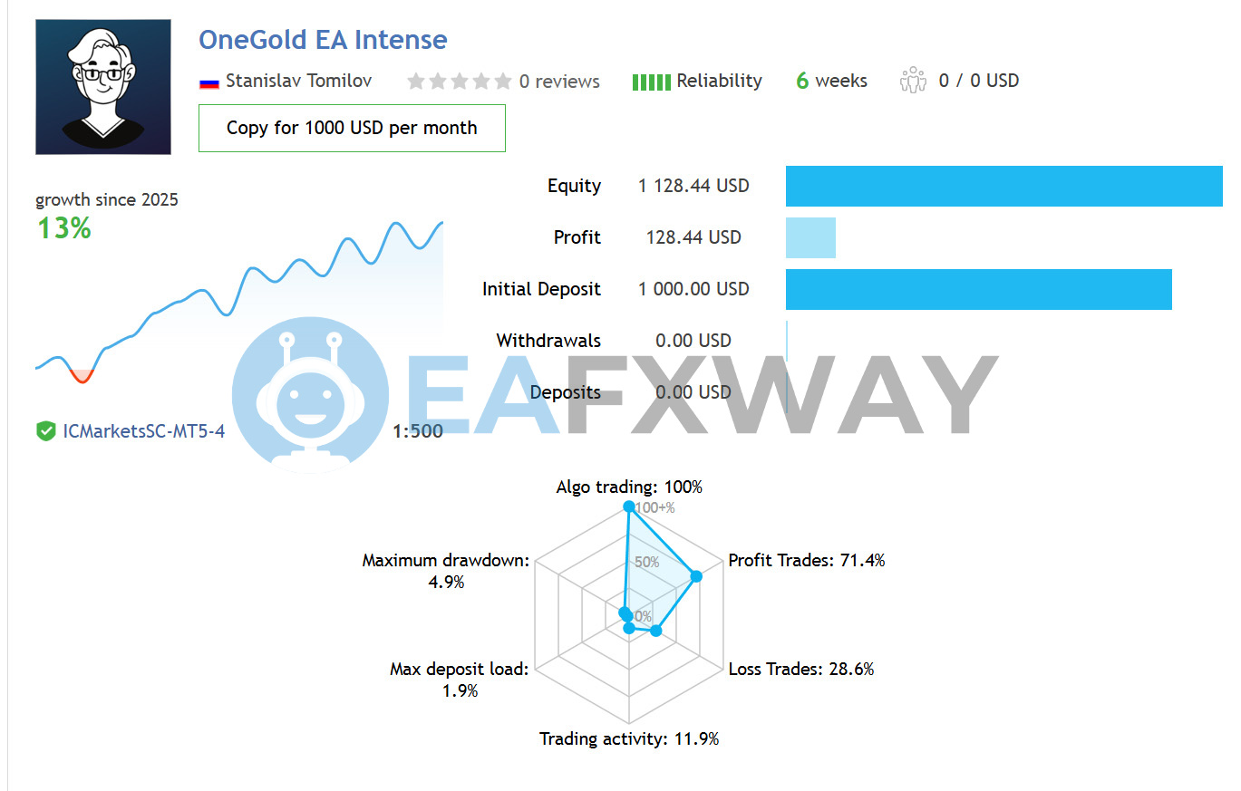 One Gold EA is an automated gold trading system for MetaTrader 4, built exclusively for XAUUSD with Conservative and Intense preset modes.