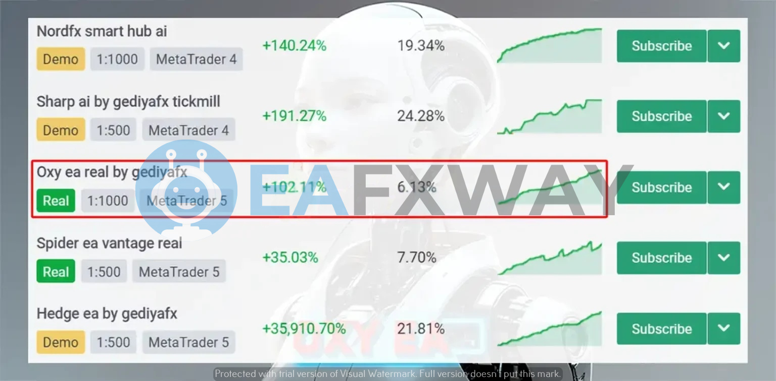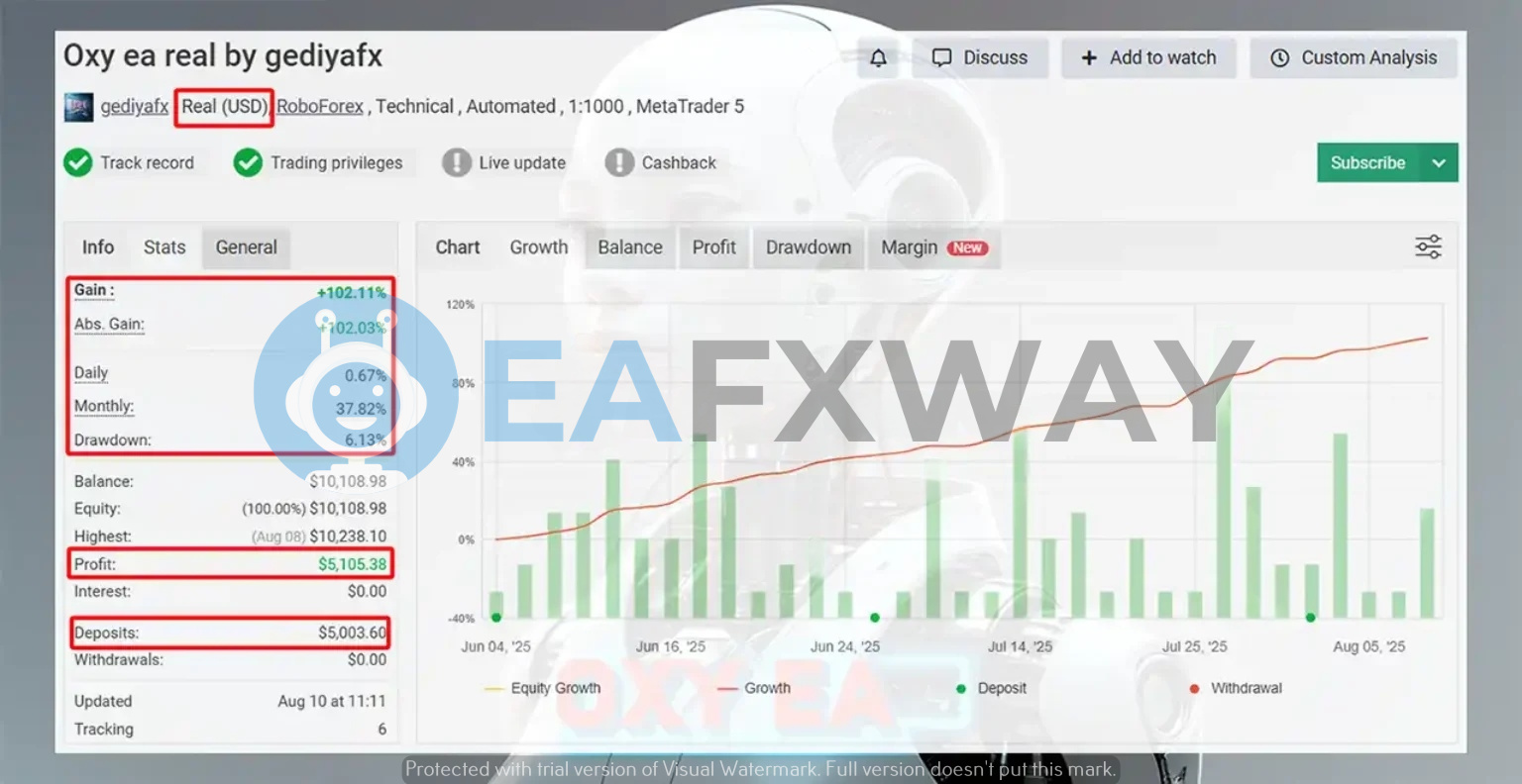 Oxy EA is a XAUUSD-focused automated scalper running on MetaTrader 5, with a verified live account tracked on MyFxBook since June 2025 under creator gediyafx. The live account records +102.11% gain with 6.13% peak drawdown over 113 trades on RoboForex. Listed on eafxway after meeting our drawdown threshold criteria.