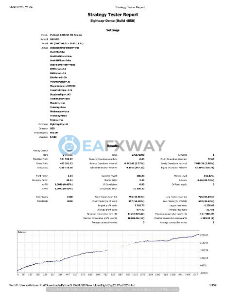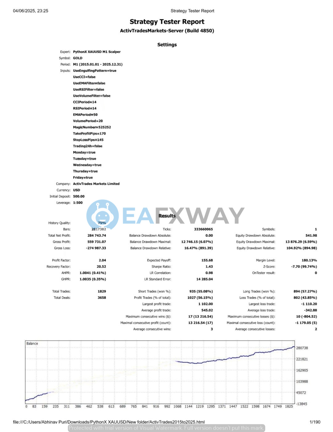 The strongest documented result is an ActivTrades backtest: $500 deposit, XAUUSD M1, January 2015 to December 2025, 1,829 trades, net profit $284,743, profit factor 2.04, balance drawdown 16.47%, Sharpe ratio 1.43. History quality was 79% — below the 99% threshold for high-confidence modeling. All figures are backtest results, not live execution.