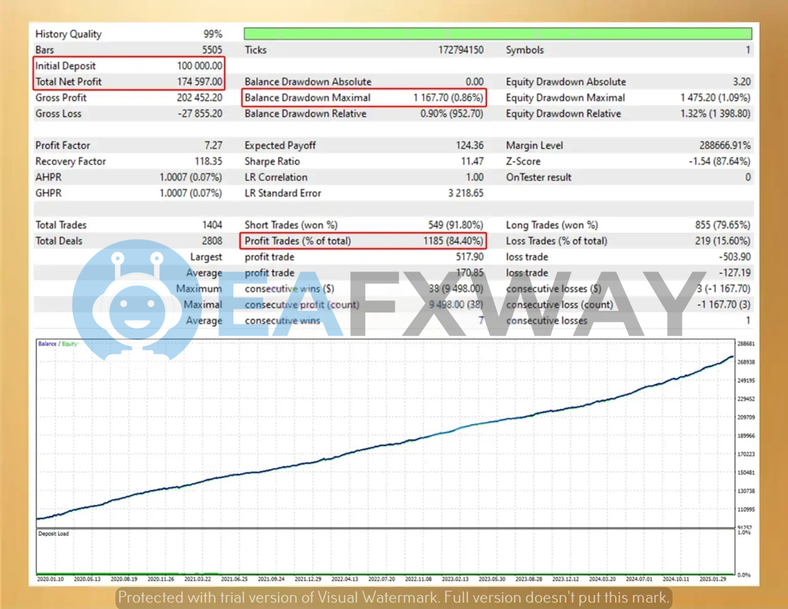Backtest at 99% modeling quality validates $174,597 net profit from a $100,000 starting balance over five years (2020–2025). The strategy benchmarks a 7.27 profit factor, 1.09% peak equity drawdown, and an 84.40% win rate across 1,404 completed trades.