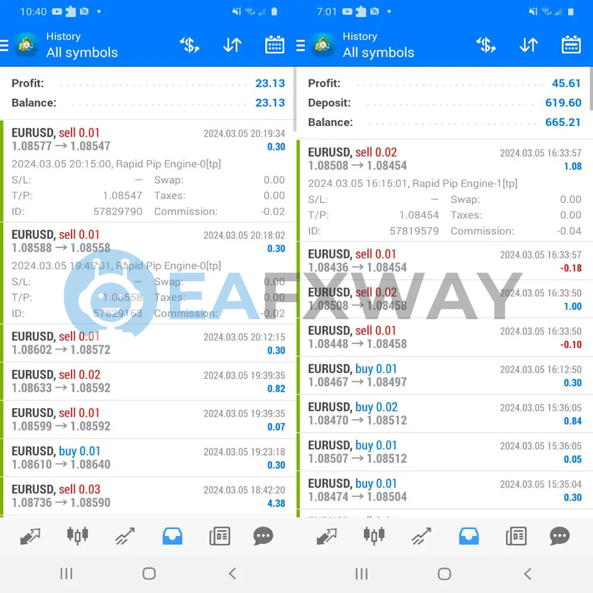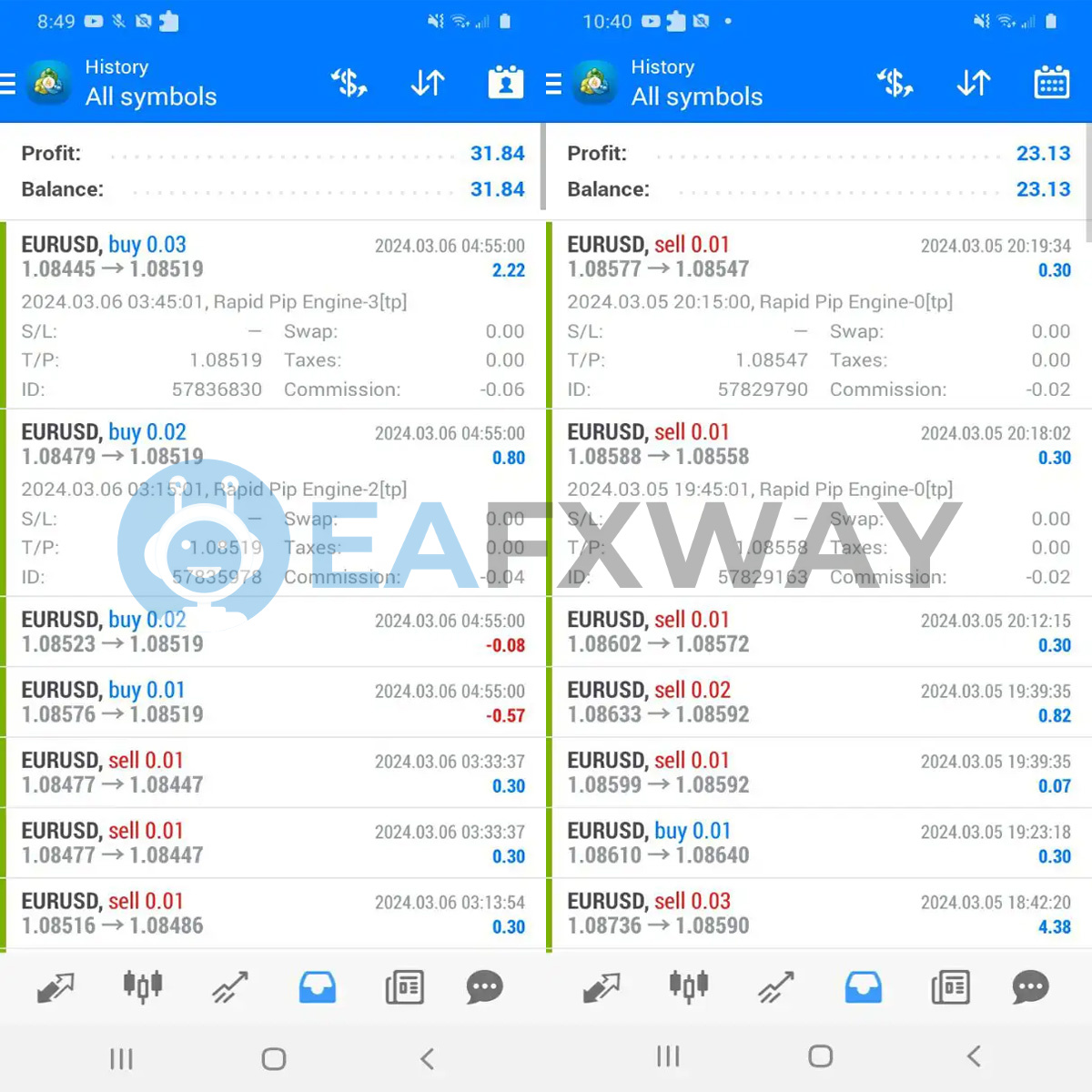 Live trading data across two MT4 accounts on March 5–6, 2024 shows the EA actively placing and closing trades on EURUSD with basket take profit logic confirmed in the trade history labels (Rapid Pip Engine-0[tp], Rapid Pip Engine-2[tp], Rapid Pip Engine-3[tp]).