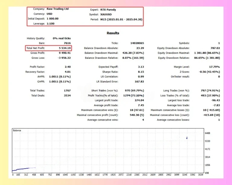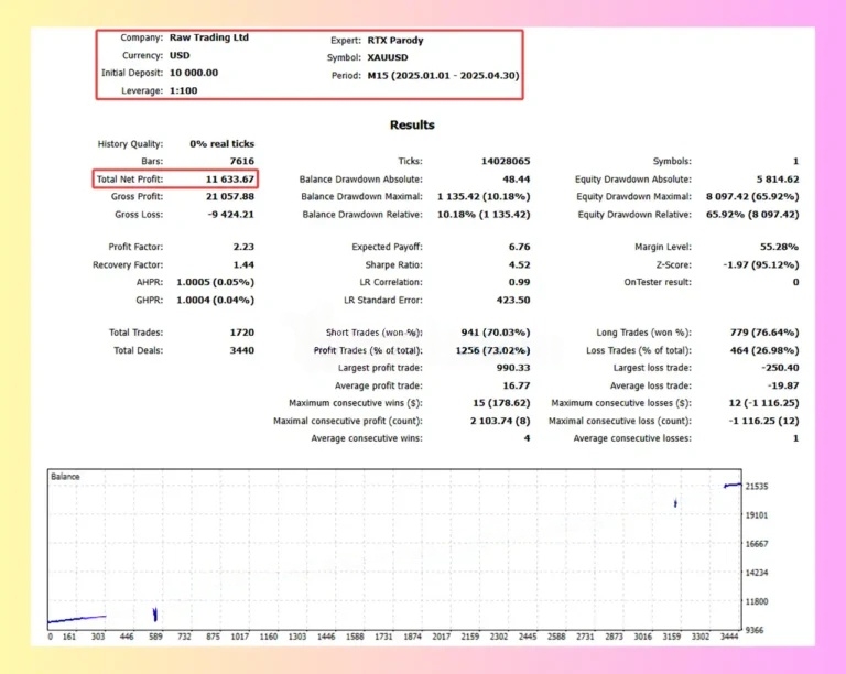 RTX Parody is an MT5 Expert Advisor targeting XAUUSD M15 using a combined pyramiding and martingale grid recovery strategy. Backtest data spanning 2023.01.01–2025.04.30 confirms a 2.23 profit factor with 73% win rate across 1,720 trades — though modeling quality is recorded at 0% real ticks, classifying this as a limited-quality backtest. A 90-day demo validation period is mandatory before live capital deployment.