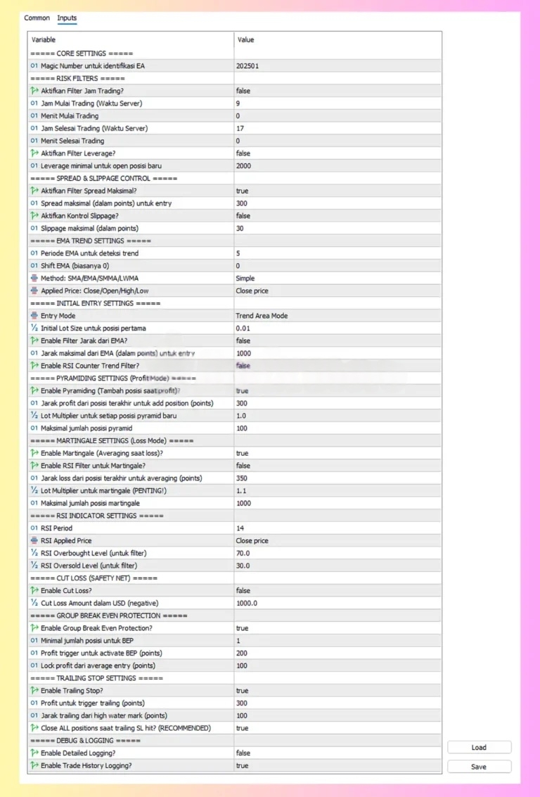 - Signal Trigger: Price enters trend area relative to EMA; spread must be under 300 points for entry to execute.