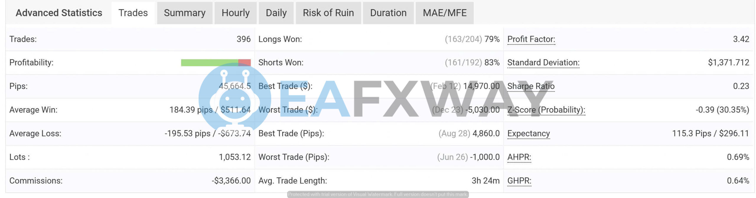 - Position Close: Closes on target pip achievement or signal reversal; average win 184.39 pips, average loss capped at -195.53 pips.