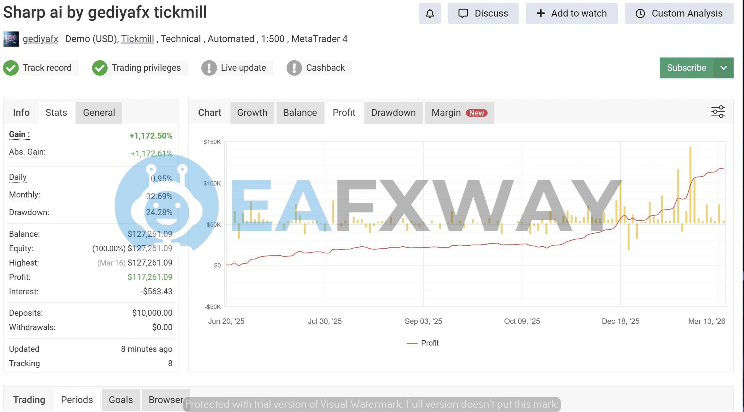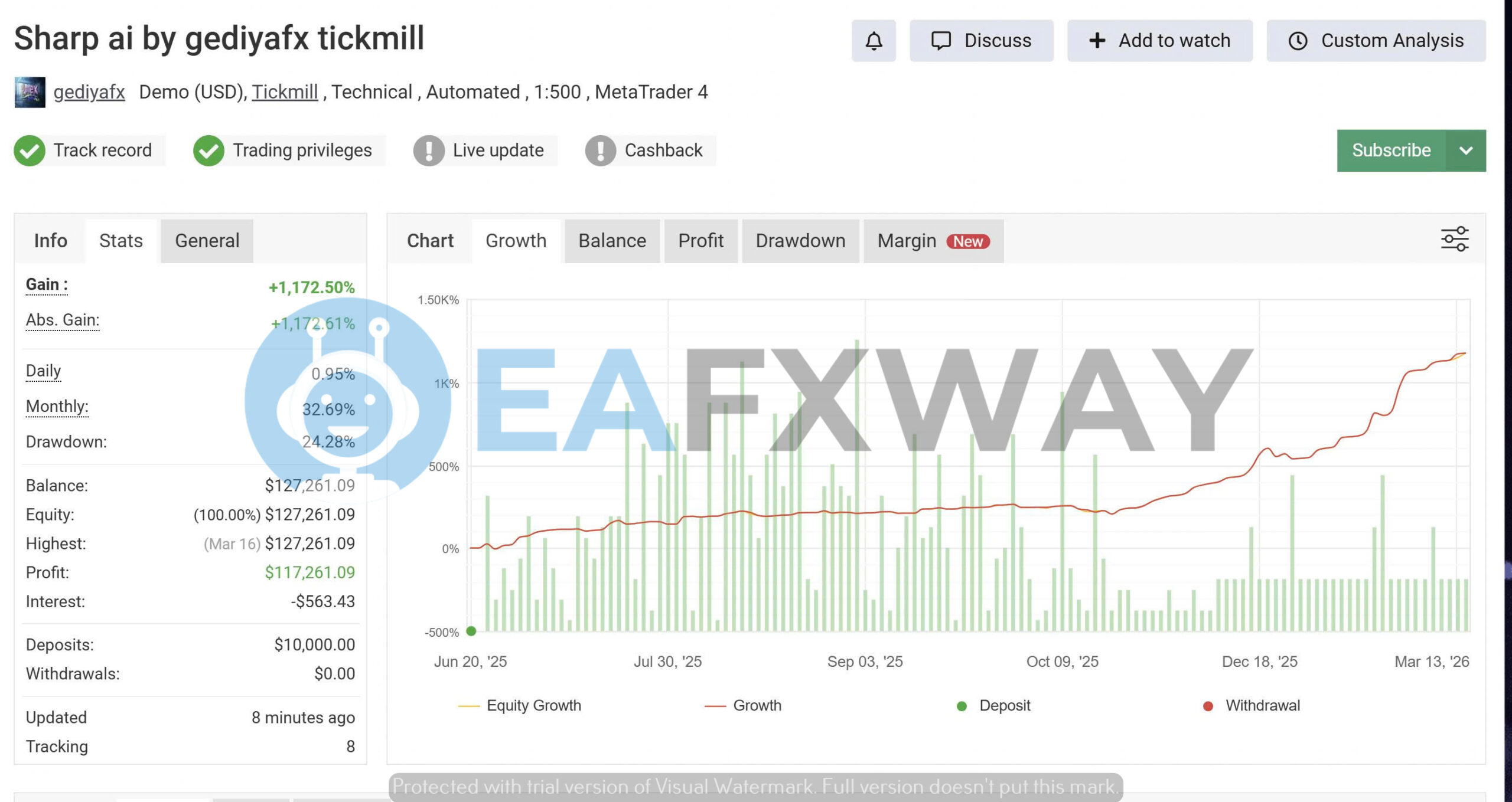 Sharp AI is a technical automated EA for MetaTrader 4, running a verified live Tickmill account from June 2025 with a 3.42 profit factor across 396 trades. MyFxBook tracking records +1,172.50% total gain over approximately 9 months from a $10,000 starting deposit. The account balance reached $127,261.09 with no withdrawals taken.