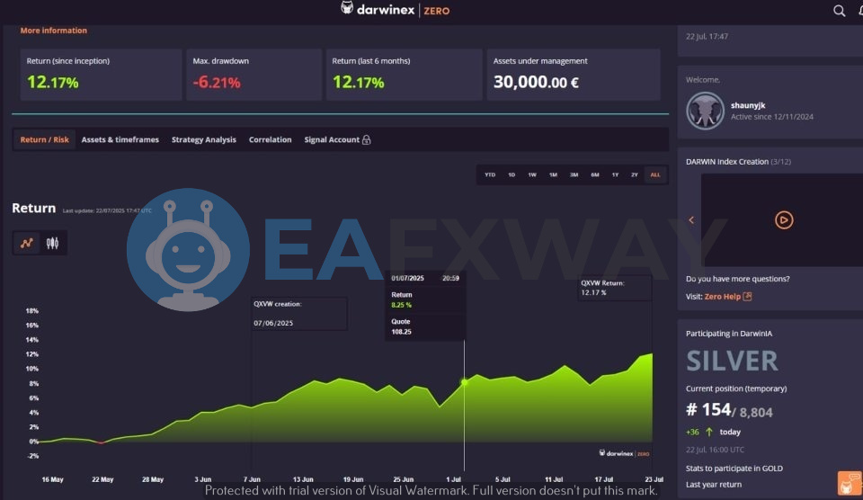 Shauns CoPilot EA is a commodity CFD-focused MT4 expert advisor with live tracking on DarwinEX ZERO, holding Silver tier status in the DarwinIA competition as of January 2026. The strategy records a 12.17% return since inception with a -6.21% peak drawdown, verified on a live €30,000 account tracked from June 2023. Listed on eafxway after meeting documented DD threshold criteria for live-verified products.