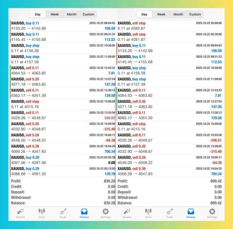 - Signal Trigger: Buy stop and sell stop pending orders placed at defined price levels during active sessions.