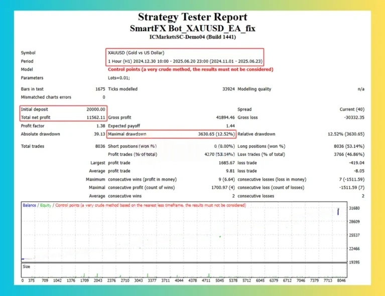 Peak drawdown of 21.69% occurs when consecutive loss trades accumulate across uncapped open positions in trending XAUUSD sessions. Control by limiting active lots to the 0.11 minimum setting, using a hard equity stop at 20%, and running a 90-day demo before live deployment. Conservative lot sizing typically keeps drawdown in the 12–15% range based on the shorter test period data.