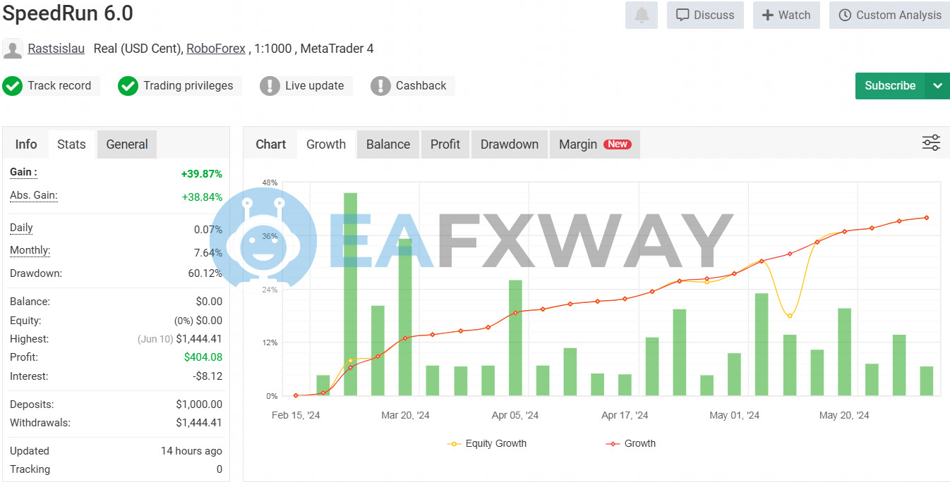 Signal two (SpeedRun 6.0): $1,000 starting deposit, USD Cent account on RoboForex, 39.87% gain, 60.12% maximum drawdown — account closed after full withdrawal of $1,444.41.