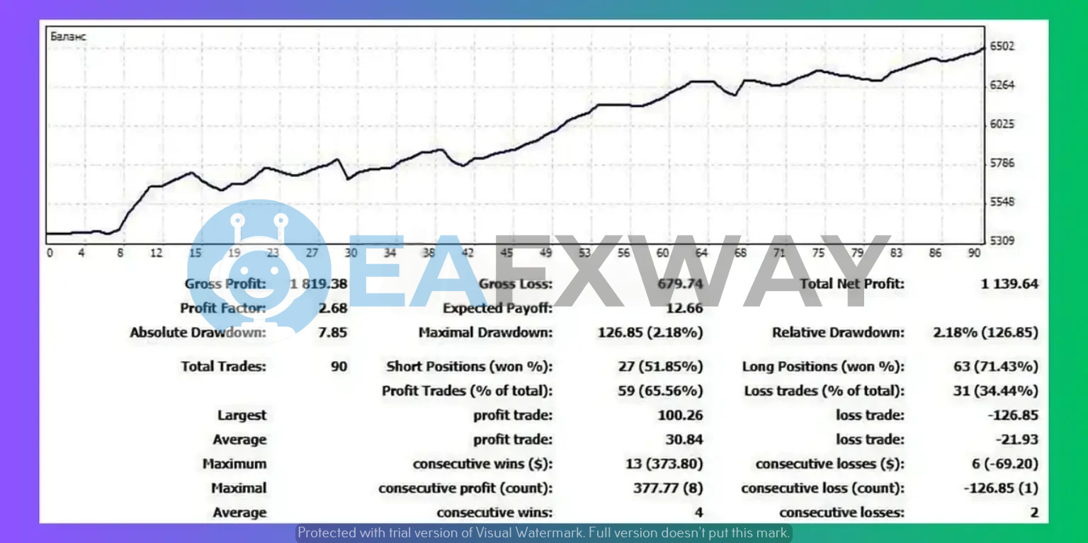 - ✅ Backtest Profit Factor: Strategy Tester benchmarks at 2.68 profit factor across 90 trades.