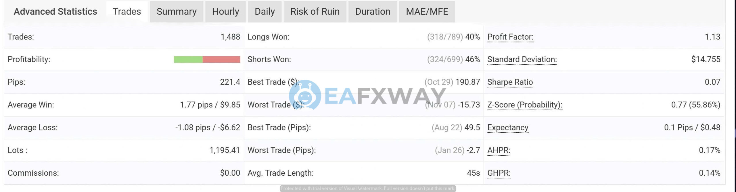 The core risk here is structural, not configurable away. At 45 seconds average duration, this EA’s edge depends entirely on execution quality. On a demo feed with zero commission (confirmed: $0.00 commissions logged), the 1.13 profit factor holds. On a real ECN account with per-trade commissions, that same volume of 1,195 total lots generates meaningful commission drag that the demo results do not reflect. A second public demo on RoboForex showed -7.75% return with PF 0.48 across 37 trades — with $52.52 commission drag on that small sample. The 36.08% peak drawdown is a demo figure; real-feed slippage on a scalper-profile EA typically widens drawdown further. This weakness is structural: it cannot be removed by settings, only sized for with lower position risk and a zero-commission ECN broker. Classification requires 90-day demo testing on your specific broker before any live capital.