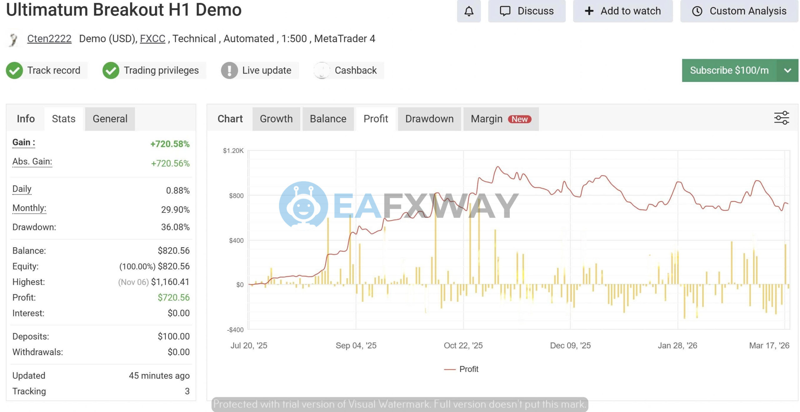 Ultimatum Breakout EA executes EURUSD and USDJPY H1 breakouts with an average trade duration of 45 seconds — functioning operationally as a scalper despite its breakout classification. A public demo account on FXCC shows 1,488 trades with a profit factor of 1.13 and 36.08% peak drawdown, starting from $100. No verified real-money account exists — that gap is disclosed here because it directly affects your deployment decision.