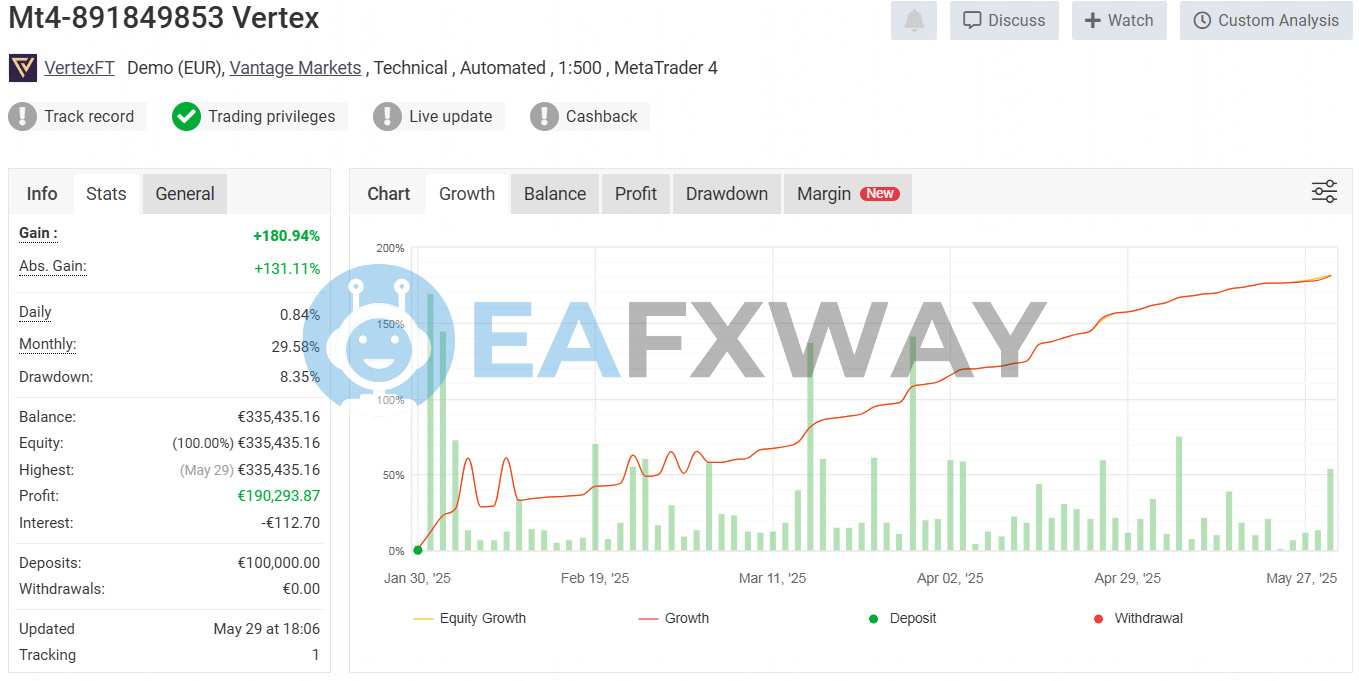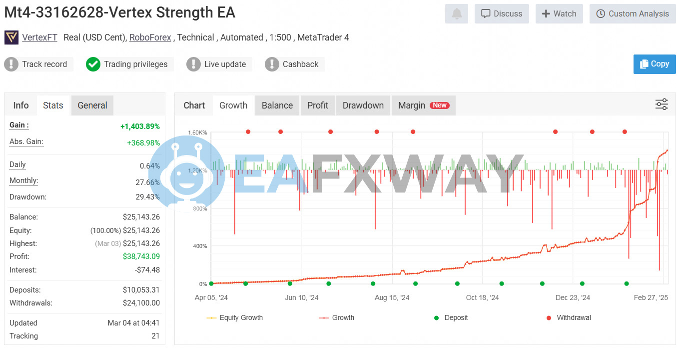 Vertex Strength EA’s live real account on RoboForex generates +1,403.89% total gain from April 2024 to February 2025—tracked on MyFxBook with $24,100 in verified withdrawals and a current balance of $25,143.26.