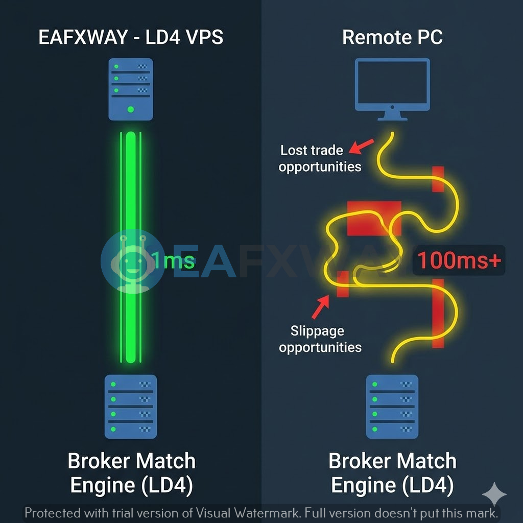 Most VPS providers use the public internet to reach the broker. Even if they are in London, the signal goes out to a public router and back in. EAFXWAY utilizes physical fiber-optic cables that connect our server racks directly to the broker’s racks within the same facility. This results in sub-millisecond latency—the same speed used by Tier-1 investment banks.